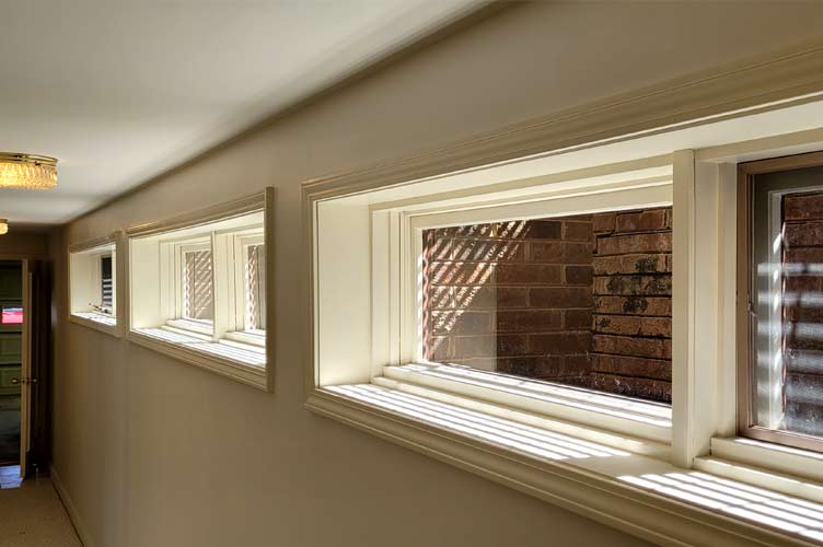 Down in the basement there is a long hall way that goes down two sides of the house (outlined by the courtyard). If you notice from the exterior pictures there are no gutters. All rain falls outside of the foundation and into the courtyard. This group of windows exposes the exterior light from the courtyard into the basement. Addi tonally around the corner is a skylight that handles bringing in additional light to the basement. The dining room had a nice buffet bar and large gold mirrors. The lighting in this room was excellent (as one would expect).