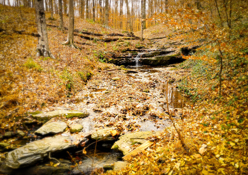 We have various features around this forest like our very own waterfall that runs into the lake behind the boathouse. Huge trees that are very old growth and are mainly hardwoods with a sprinkle of Pine here and there. When the leaves fall around here they really put a new layer on the ground.